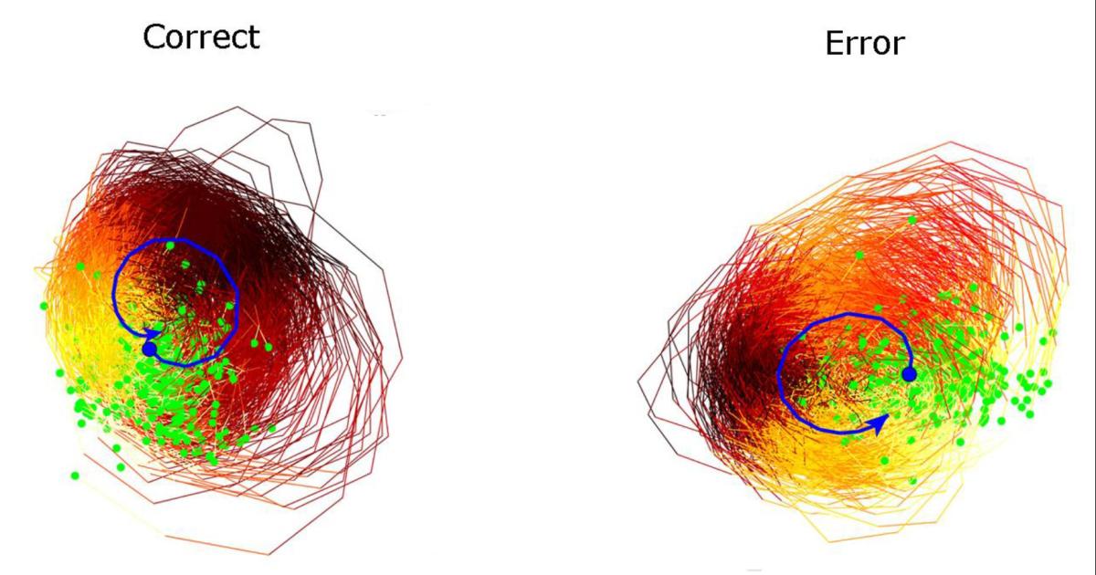Indeed, the rotations predicted the animal’s performance on the task. In cases where the distraction didn’t cause a mistake, the neural data showed a complete circle, indicating the recovery was complete. In cases where the distractions caused the animals to err, the trajectory fell short of making a full circle (by an average of 30 degrees). The trajectory during errant sessions showed a slower speed, which could explain the lack of recovery from distraction.